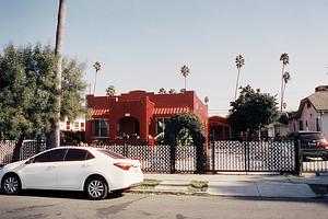 Los Angeles, Red house, Palm trees, film photo, analog image, 35mm, cinecolor, 800T